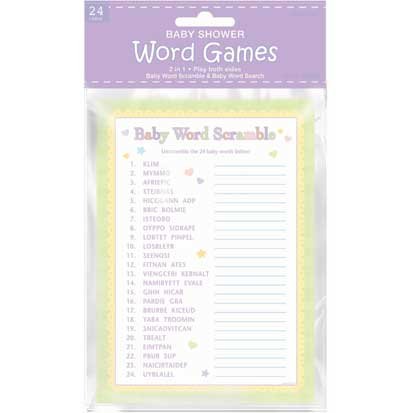 Your guests will have a blast playing baby shower word games! Each package includes 24 double sided sheets featuring Baby Word Scramble and Baby Word Search. Each sheet measures 7"L x 5"W.